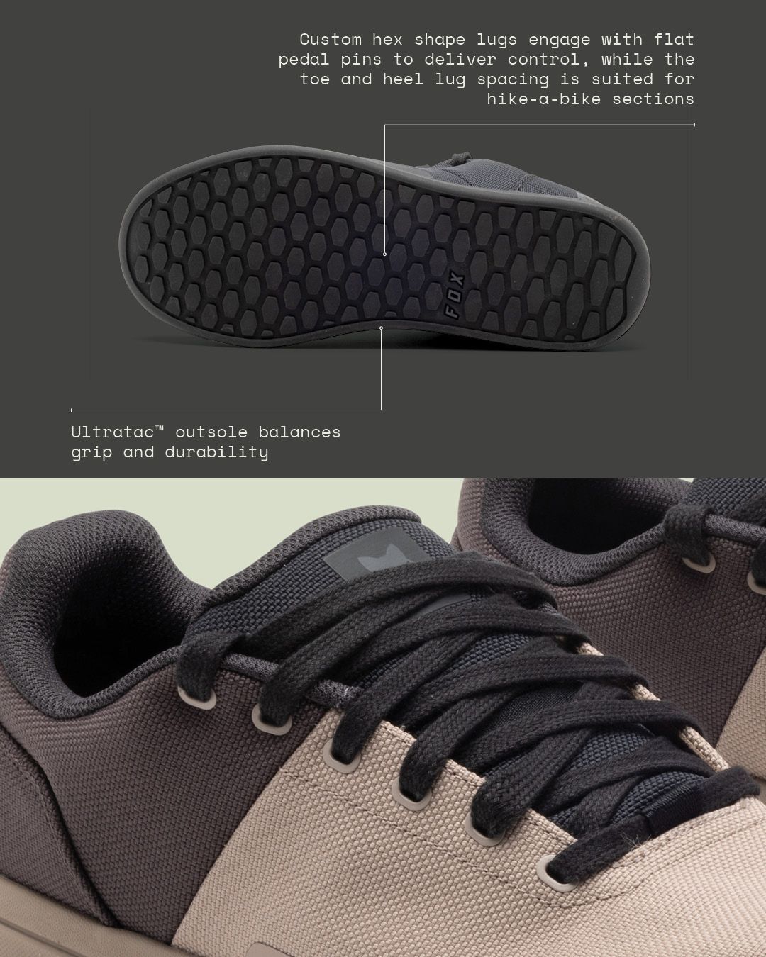 Partendo dalla suola, troviamo la speciale mescola di gomma Ultratac™, brevettata Fox e sviluppata con in mente la miglior aderenza possibile ai pedali.